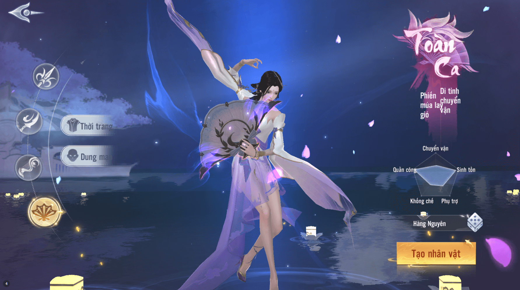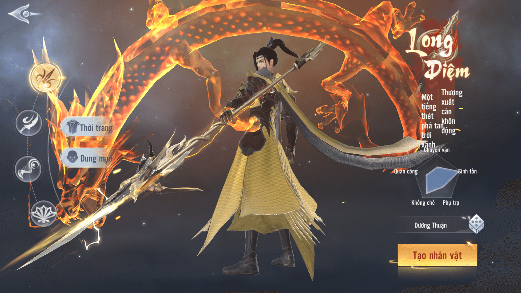 Nam nhân vật tiên hiệp cầm thương, với sự tự tin và uy dũng. Biệt danh Thương Xuất Càn Khôn Động thể hiện khả năng tung ra những cú đâm mạnh mẽ làm rung chuyển trời đất. Di chuyển nhanh nhẹn, mỗi đòn tấn công đều chí mạng và không để lại cơ hội cho đối thủ. Trong thế giới thần ma là biểu tượng của sức mạnh và kiên định.